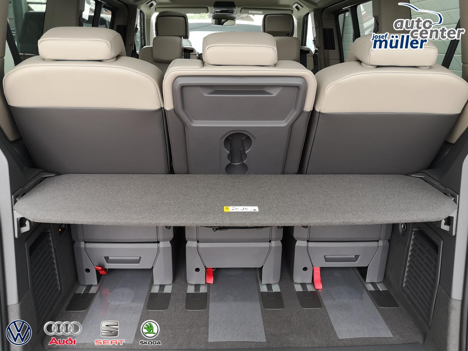 Fahrzeug 8-fach-bereift, Leichtmetallräder 7,5J x 18 (Sport Edition Design TN28, schwarz glanzgedreht) mit Sommerreifen 235 50 R18, Leichtmetallräder 7,5 J x 18 ""Toshima"" schwarz mit Winterreifen (M+S Kennung inkl. Schneeflocke / Allwetterreifen), (0NP) Bulliplakette am Kotflügel, (1U3) Bodenschienen mit Multifunktionstisch inkl. 3 Becherhalter, verschiebbar auf der vollständigen Länge des Schienensystems, (2FT) Multifunktionslederlenkrad beheizbar mit Schaltwippen, (4A3) Sitzheizung vorne, (4GX) Frontscheibe beheizbar und geräuschdämmend, (4K5) Zentralverriegelung Keyless Advance (schlüsselloses Öffnen und Starten),(6I6) Travelassistent, (6KF) Scheinwerferleiste hinterleuchtet, (7AL) Diebstahlwarnanlage, (7UY) Radio Navigationssystem Discover Pro, (9AH) Klimaanlage ""Air Care Climatronic"", (N0K) Sitzbezug Bi-Colour Leder ""Savona"", (1M6) Anhängerkupplung schwenkbar, Parklenkassistent inkl. Rückfahrkamera, (Z8A) Schiebefenster im Fahrgastraum links und rechts, Fenster ab B-Säule abgedunkelt, (ZBR) 7 Sitzer: Sitzvariante 2-2-3 (Vis-a-Vis entgegen der Fahrrichtung) inkl. 4 Armlehnen, (2H5) Fahrprofilauswahl, (3FG) Panoramaglasdach, (7W7) Proaktives Insassenschutzsystem, (9IJ) Mobiltelefon-Schnittstelle ""Comfort"" inkl. induktive Ladestation, (9VV) Soundsystem ""Harman Kardon"" inkl. 13 Lautsprecher, 840 Watt Gesamtleistung und Subwoofer, (KS1) Head Up Display, (P2G) Parkpaket Advance, Parklenkassistent inkl. ""Area View"" inkl. Rückfahrkamera, (ZED) Easy Open Paket Advanced, Umfeldbeleuchtung an der Heckklappe, Ambientebeleuchtung 30-farbig, Heckklappe sowie Schiebetüren elektrisch inkl. Easy Open/Close Funktion,