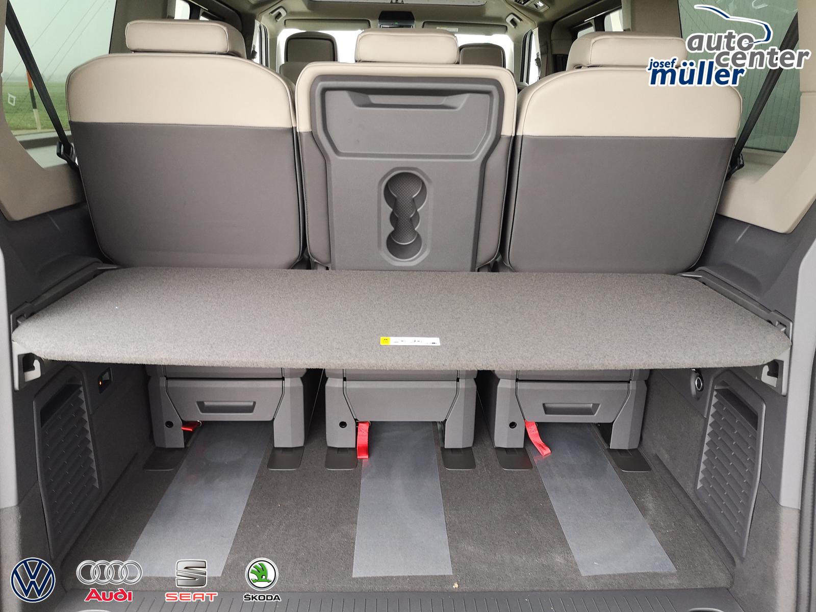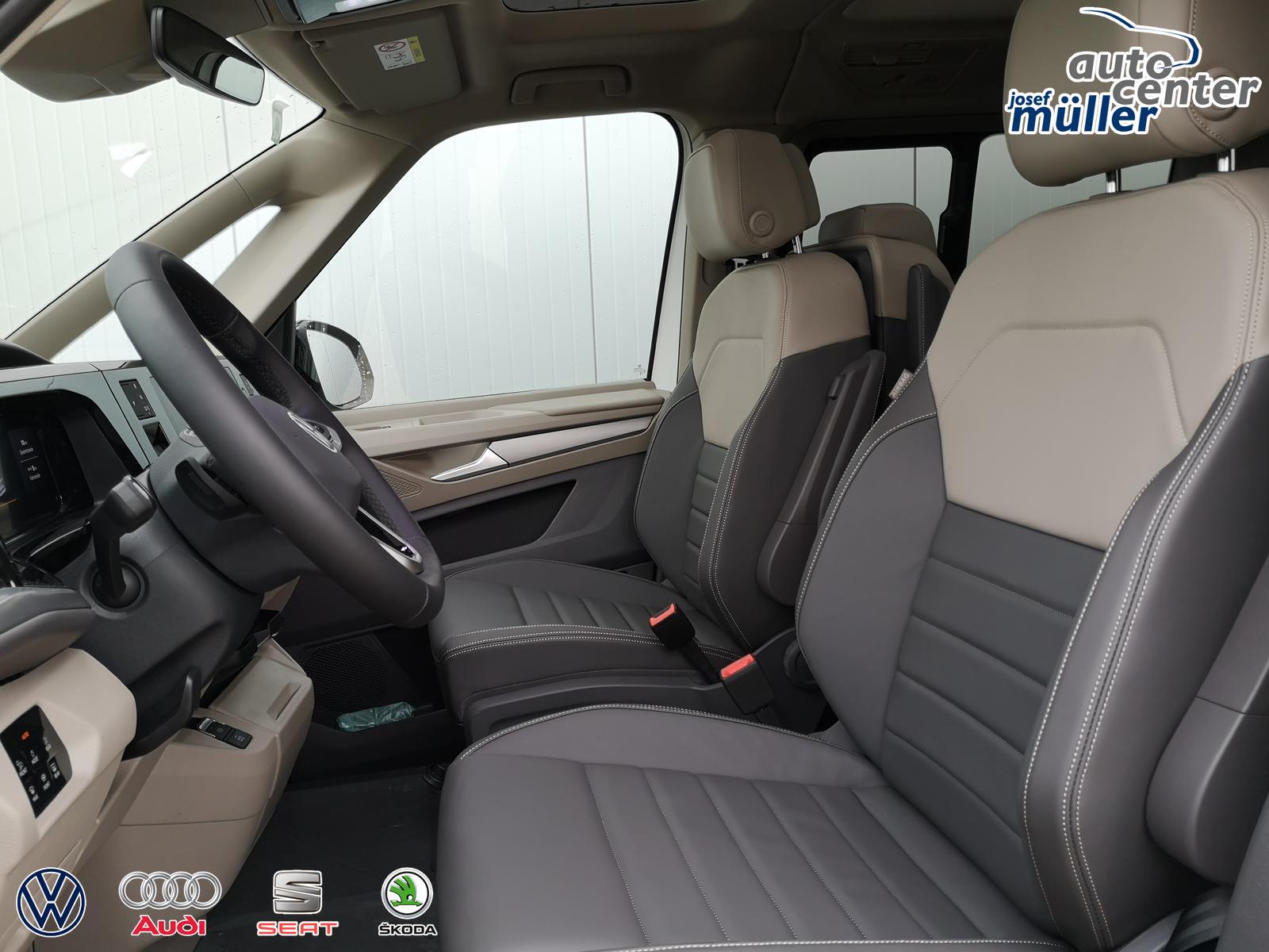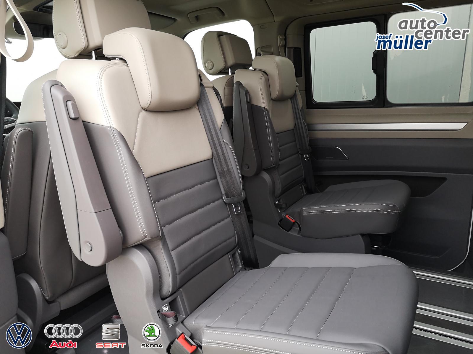 Fahrzeug 8-fach-bereift, Leichtmetallräder 7,5J x 18 (Sport Edition Design TN28, schwarz glanzgedreht) mit Sommerreifen 235 50 R18, Leichtmetallräder 7,5 J x 18 ""Toshima"" schwarz mit Winterreifen (M+S Kennung inkl. Schneeflocke / Allwetterreifen), (0NP) Bulliplakette am Kotflügel, (1U1) Bodenschienen für Multifunktionstisch (MFT nicht enthalten), (2FT) Multifunktionslederlenkrad beheizbar mit Schaltwippen, (4A3) Sitzheizung vorne, (4GX) Frontscheibe beheizbar und geräuschdämmend, (4K5) Zentralverriegelung Keyless Advance (schlüsselloses Öffnen und Starten),(6I6) Travelassistent, (6KF) Scheinwerferleiste hinterleuchtet, (7AL) Diebstahlwarnanlage, (7UY) Radio Navigationssystem Discover Pro, (9AH) Klimaanlage ""Air Care Climatronic"", (N0K) Sitzbezug Bi-Colour Leder ""Savona"", (1M6) Anhängerkupplung schwenkbar, Parklenkassistent inkl. Rückfahrkamera, (Z8A) Schiebefenster im Fahrgastraum links und rechts, Fenster ab B-Säule abgedunkelt, (ZBR) 7 Sitzer: Sitzvariante 2-2-3 (Vis-a-Vis entgegen der Fahrrichtung) inkl. 4 Armlehnen, (2H5) Fahrprofilauswahl, (3FG) Panoramaglasdach, (7W7) Proaktives Insassenschutzsystem, (9IJ) Mobiltelefon-Schnittstelle ""Comfort"" inkl. induktive Ladestation, (9VV) Soundsystem ""Harman Kardon"" inkl. 13 Lautsprecher, 840 Watt Gesamtleistung und Subwoofer, (KS1) Head Up Display, (P2G) Parkpaket Advance, Parklenkassistent inkl. ""Area View"" inkl. Rückfahrkamera, (ZED) Easy Open Paket Advanced, Umfeldbeleuchtung an der Heckklappe, Ambientebeleuchtung 30-farbig, Heckklappe sowie Schiebetüren elektrisch inkl. Easy Open/Close Funktion,
