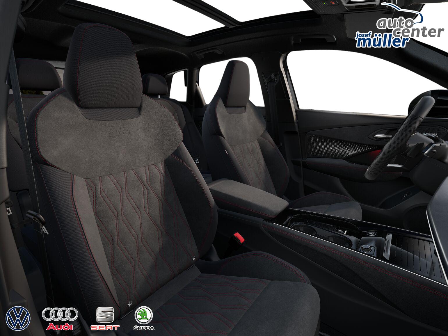 • Interieur S line mit Sportsitzen Mikrofaser (Sportsitze vorn, Sitzmittelbahnen in Mikrofaser Schwarz, Sitzseitenwangen und Kopfstützen in Stoff, Kontrastnähte in Grau, Vordersitze in Rautenmuster, Mikrofaser Dinamica, Ambientebeleuchtung Pro, Ladekantenschutz in Edelstahl, Pedale in Edelstahl)