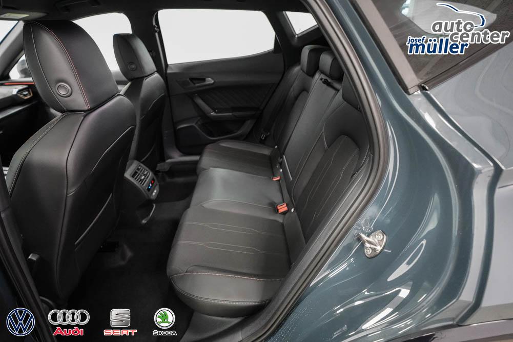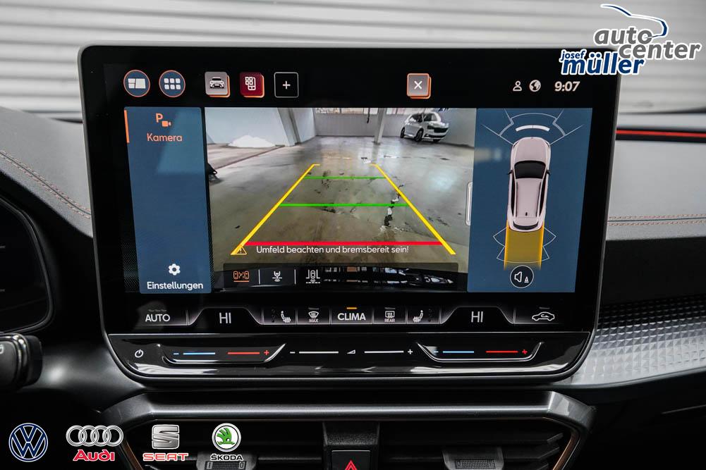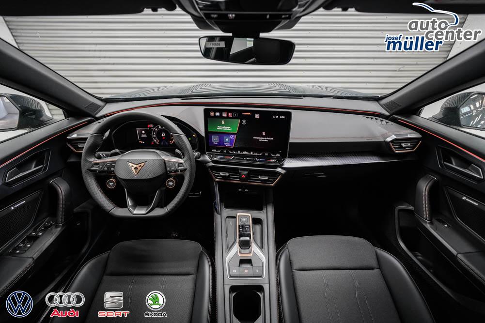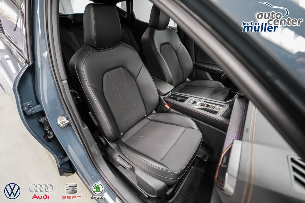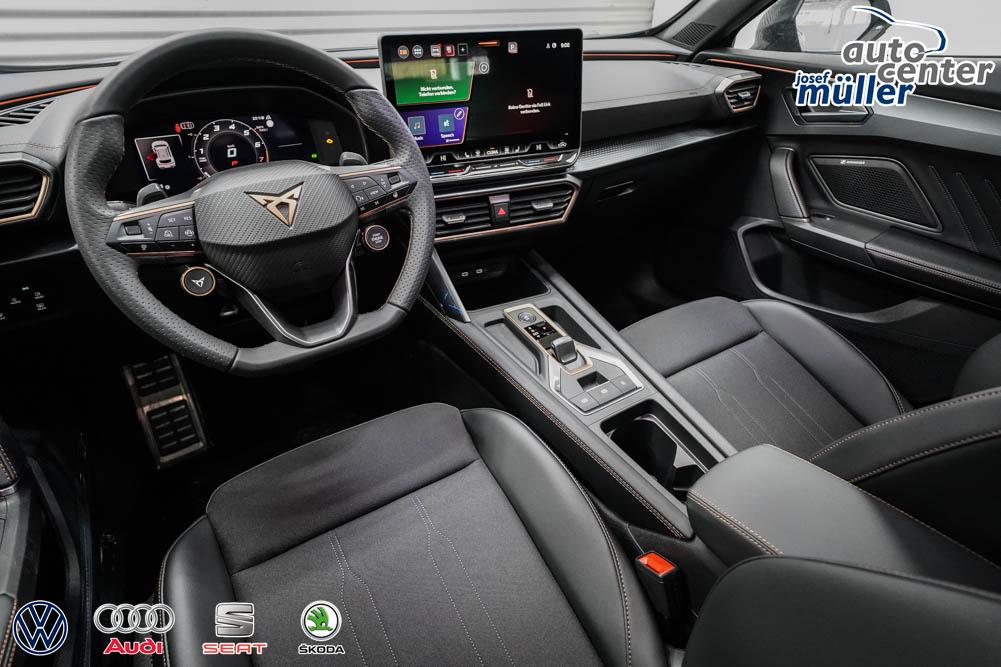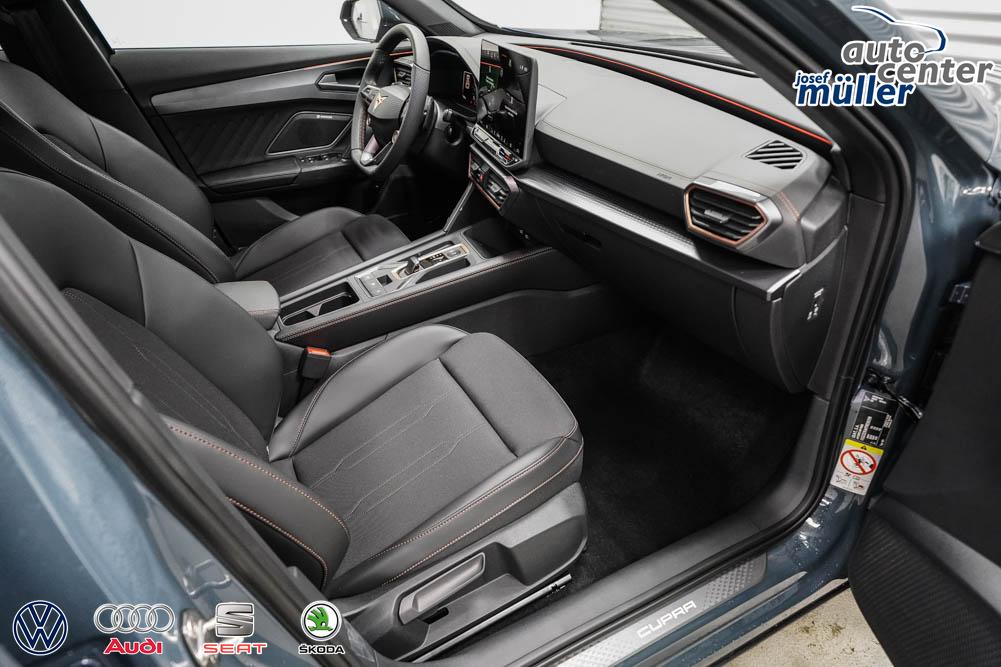 Beifahrersitz höhenverstellbar, Fahrersitz höhenverstellbar, Lederlenkrad, Lendenwirbelstütze, Mittelarmlehne vorne, Sitzbezug Stoff, geteilt umklappbare Rücksitzlehne, Lenkrad höhenverstellbar, Smart Wraparound Interieur Light, Beheizbares Lenkrad, Multifunktionslenkrad, Isofix, Isofix Beifahrersitz, abgedunkelte Scheiben, 18 Zoll Alufelgen , Dachreling schwarz, ABS, Alarmanlage, Außenspiegel elektrisch einstell-/anklappbar, Fensterheber elektrisch, Kopfairbags, Nebelscheinwerfer, Seitenairbags, Servolenkung, Sitzheizung, ESP, Wegfahrsperre, Außenspiegel beheizbar, Beifahrerairbag, Fahrerairbag, Parkpilot hinten, Parkpilot vorne, Reifendruckkontrolle, Regensensor, Lichtsensor, Digital Cockpit, Anhängekupplung schwenkbar, Tempomat Abstand ACC, Spurhalteassistent, Verkehrszeichenerkennung, LED-Scheinwerfer, Tagfahrlicht, Rückfahrkamera, Elektrische Heckklappe inkl. Virtual Pedal, KeylessEntry, StartStopSystem, Innenspiegel automatisch abbl., Müdigkeitswarnsystem, Notrufsystem, Schaltwippen, Klimaautomatik 3-Zonen, Geschwindigkeitsbegrenzer, Android Auto, Apple Carplay, Freisprecheinrichtung, Induktionsladestation, Sprachsteuerung, USB, Radio, Radio DAB, Bluetooth, Bordcomputer, IMMERSIVE by Sennheiser, Full Link, Cupra Full Link, variabler Ladeboden,