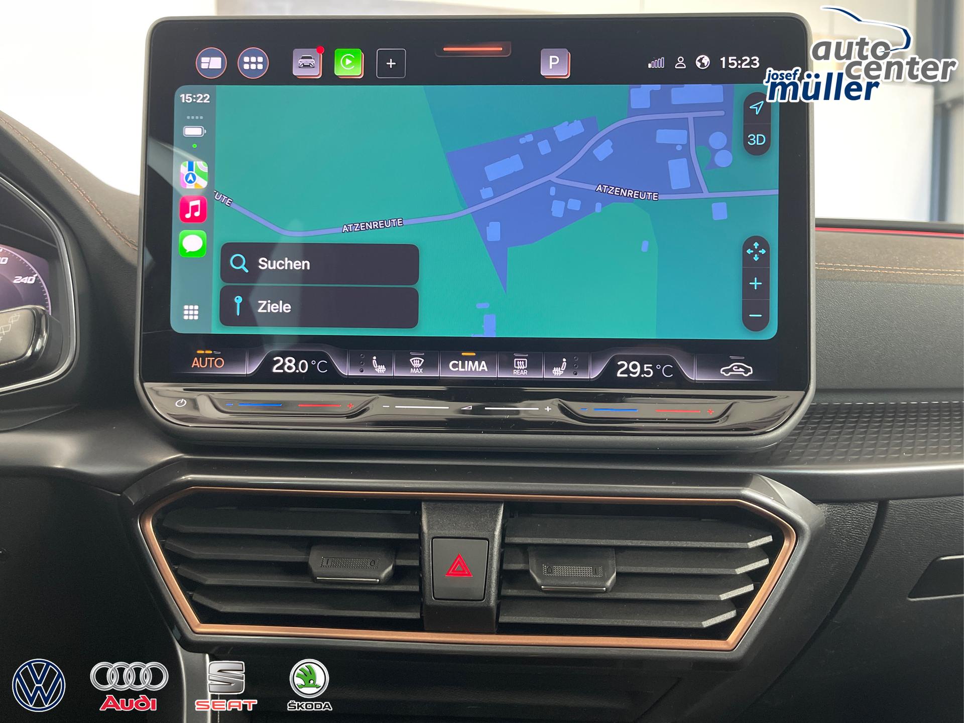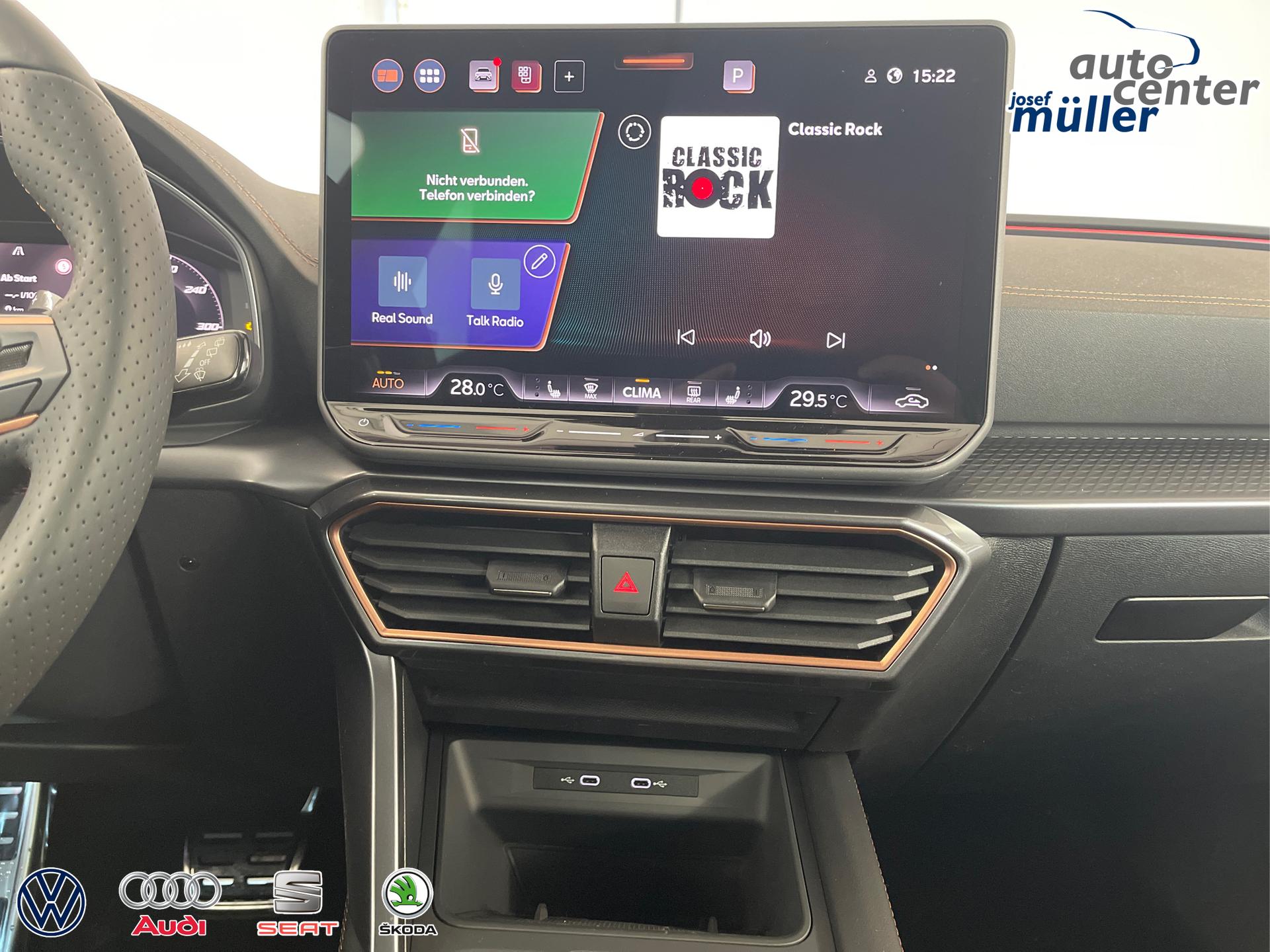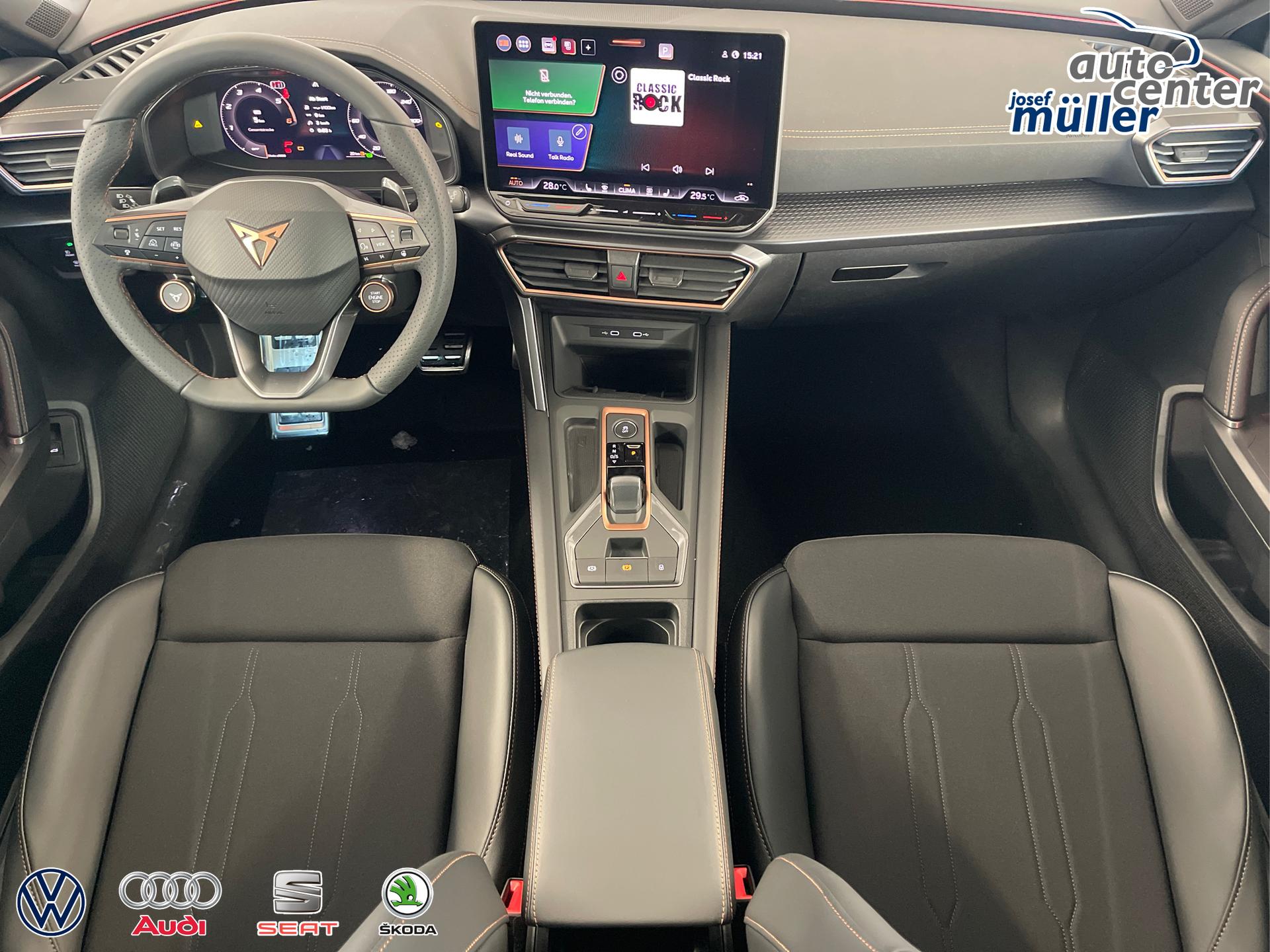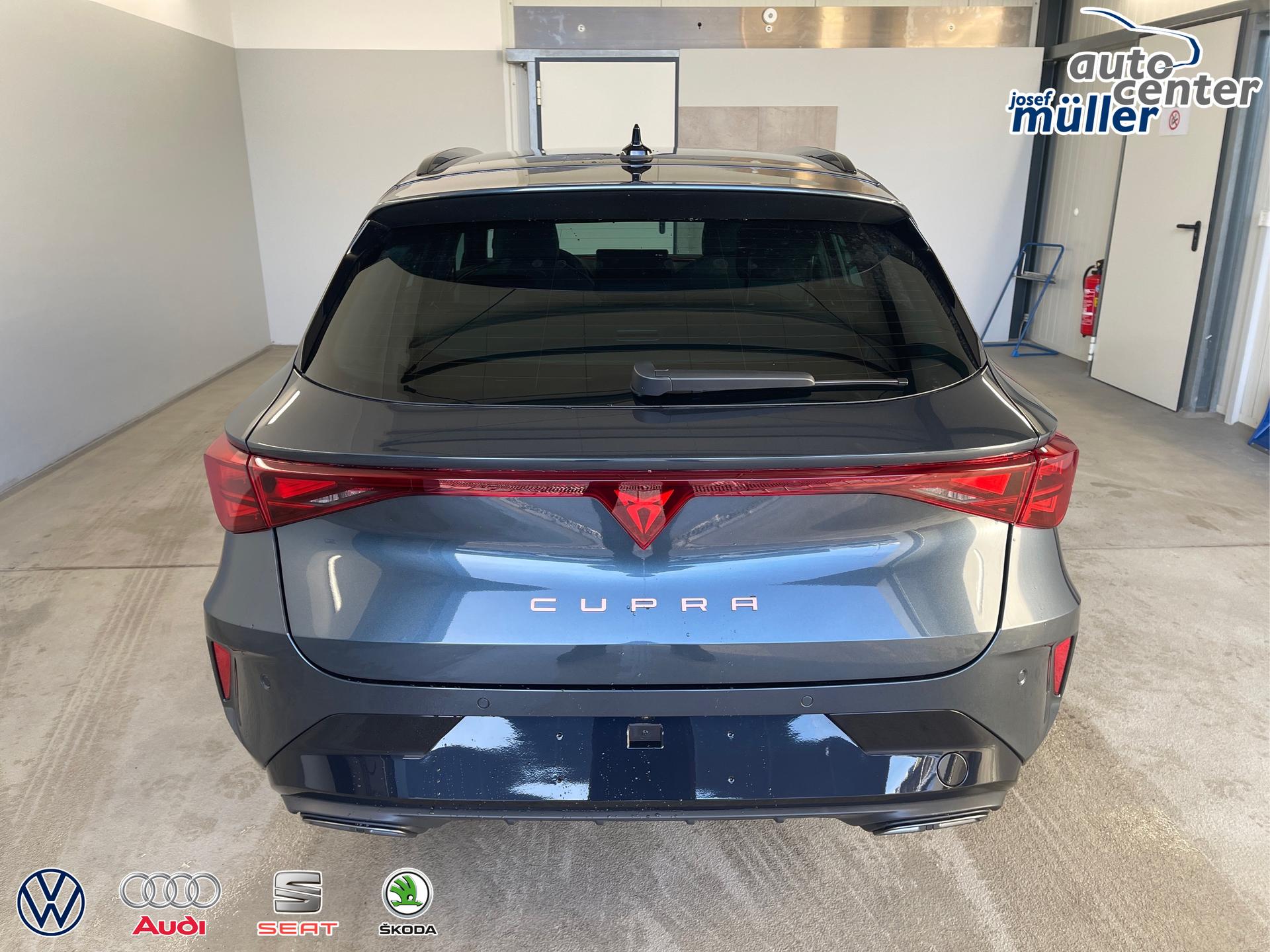 • 18 Zoll Leichtmetallräder, Außenspiegel elektrisch einstell- und beheizbar, Dachreling Schwarz, Wärmeschutzverglasung, Pedale in Aluminium, Doppelter Laderaumboden, Laderaumabdeckung, CUPRA Einstiegsleisten vorne mit Beleuchtung, Sportsitze vorn, Vordersitze höhenverstellbar, Lendenwirbelstütze für die Vordersitzlehnen, Dreipunkt-Sicherheitsgurte, 3D-LED-Rückleuchten mit dynamischen Blinker, Sicherheitsinnenspiegel automatisch abblendend, Front-Querverkehrassistent, Voll-LED-Scheinwerfer inkl. LED-Tagfahrlicht, Coming/Leaving Home Funktion, Lichtsensor, Fernlichtassistent "Light Assist", ParkPilot vorn und hinten, Virtual Cockpit 10 Zoll inkl. Bordcomputer, Radio "Infotainment" (Farbdisplay, Touchscreen), USB-C Anschlüsse, Adaptive Geschwindigkeitsregelung ACC mit Follow-to-Stop (Geschwindigkeitsregelanlage inkl. Geschwindigkeitsbegrenzung), Mittelarmlehne vorn, Klimaautomatik 3-Zonen-Climatronic, Connectivity-Box (Freisprecheinrichtung Bluetooth), Wireless App-Connect, Fahrprofilauswahl, Gepäckraumbeleuchtung, Leseleuchten vorn und hinten, Wärmeschutzverglasung, Servolenkung, Regensensor, Make-up-Spiegel in den Sonnenblenden, Sprachbedienung, Wegfahrsperre, Zentralverriegelung mit Funkfernbedienung, Front Assist inkl. City-Notbremsfunktion, Notrufsystem eCall, Verkehrszeichenerkennung, Airbag für Fahrer und Beifahrer, Beifahrerairbag-Deaktivierung, Seitenairbag vorn, Kopfairbags vorn, Center-Airbag, Fensterheber vorn und hinten elektrisch, Digitaler Radioempfang DAB, Müdigkeitserkennung, Aufmerksamkeitserkennung, ESC, ABS, ASR, XDS, Spurhalteassistent "Lane Assist", Reifendruckkontrolle, Tire-Mobility-Set, Fußgängererkennung, Radfahrererkennung, Start-Stopp-Anlage, Scheiben ab der B-Säule abgedunkelt